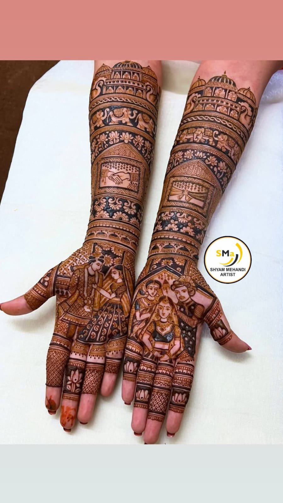 Full-hand premium bridal mehndi with detailed traditional and royal wedding artwork.